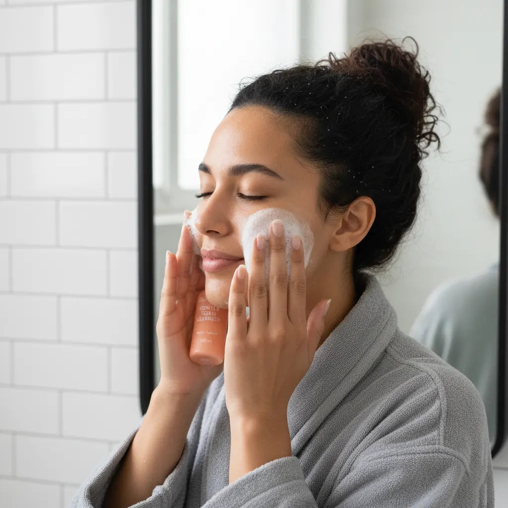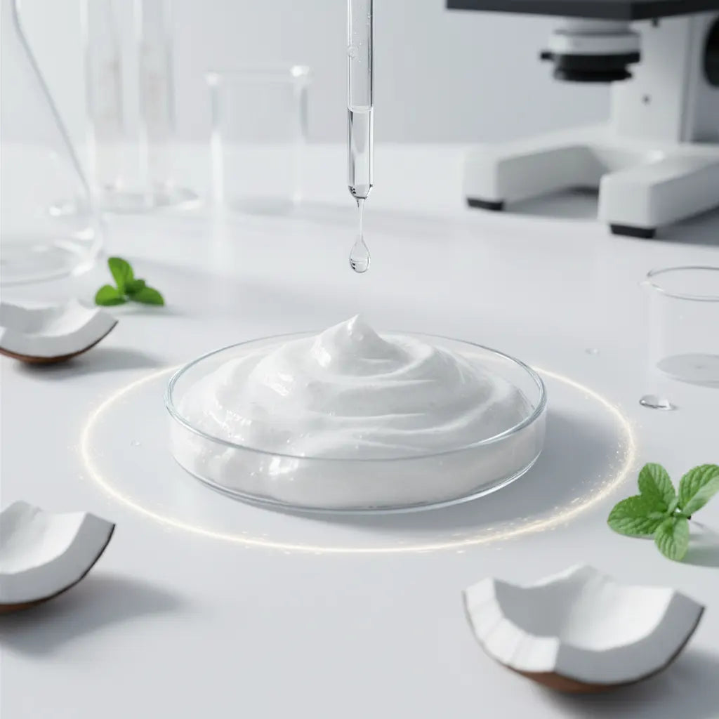 Unsere Creme-zu-Schaum-Formel verwandelt sich mit Wasser in einen sanften, luxuriösen Schaum. Der kokosölbasierte Tensid löst Unreinheiten, Make-up und überschüssiges Öl effektiv auf, während er das natürliche pH-Gleichgewicht Ihrer Haut und die Feuchtigkeitsbarriere respektiert.